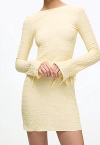 Femme portant une mini-robe à manches longues texturée jaune clair avec un col bateau et un motif de tissu ondulé.