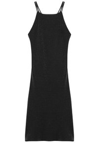 Robe mini sans manches noire en matériau scintillant avec une coupe ajustée. Elle présente un col montant et de fines bretelles.