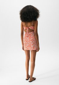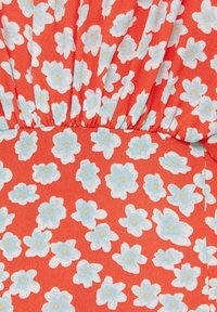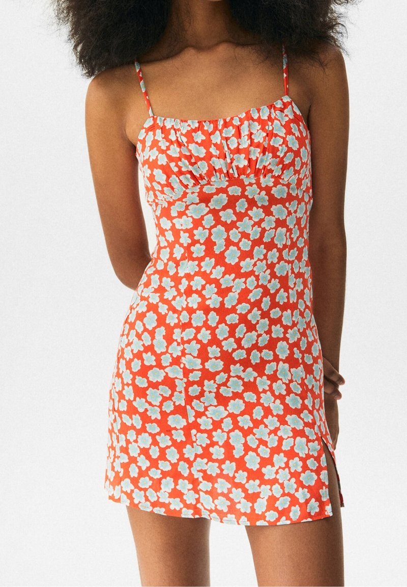 Femme portant une mini robe rouge sans manches avec un imprimé floral bleu et blanc et de fines bretelles, debout devant un fond uni.