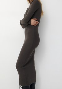 Robe marron à manches longues et ajustée, fabriquée en tissu extensible, avec un col montant et des fentes. Associée à des bottes noires à lacets.