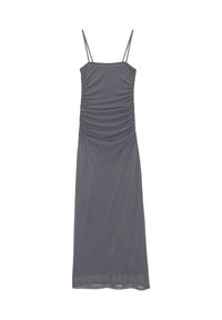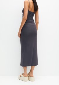 Robe longue gris foncé, avec un corsage ajusté plissé, de fines bretelles et un tissu lisse et extensible. Associée à des sandales compensées.