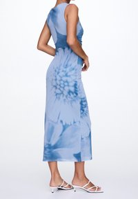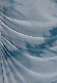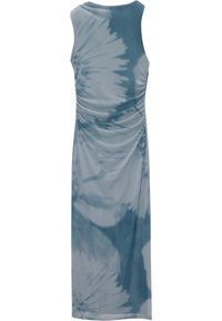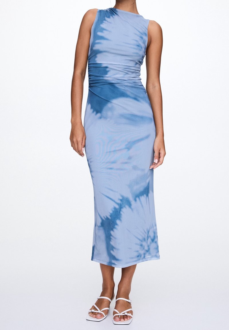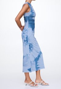 Robe midi tie-dye bleu avec une silhouette ajustée, sans manches et des détails froncés à la taille. Tissu lisse et subtil éclat.