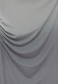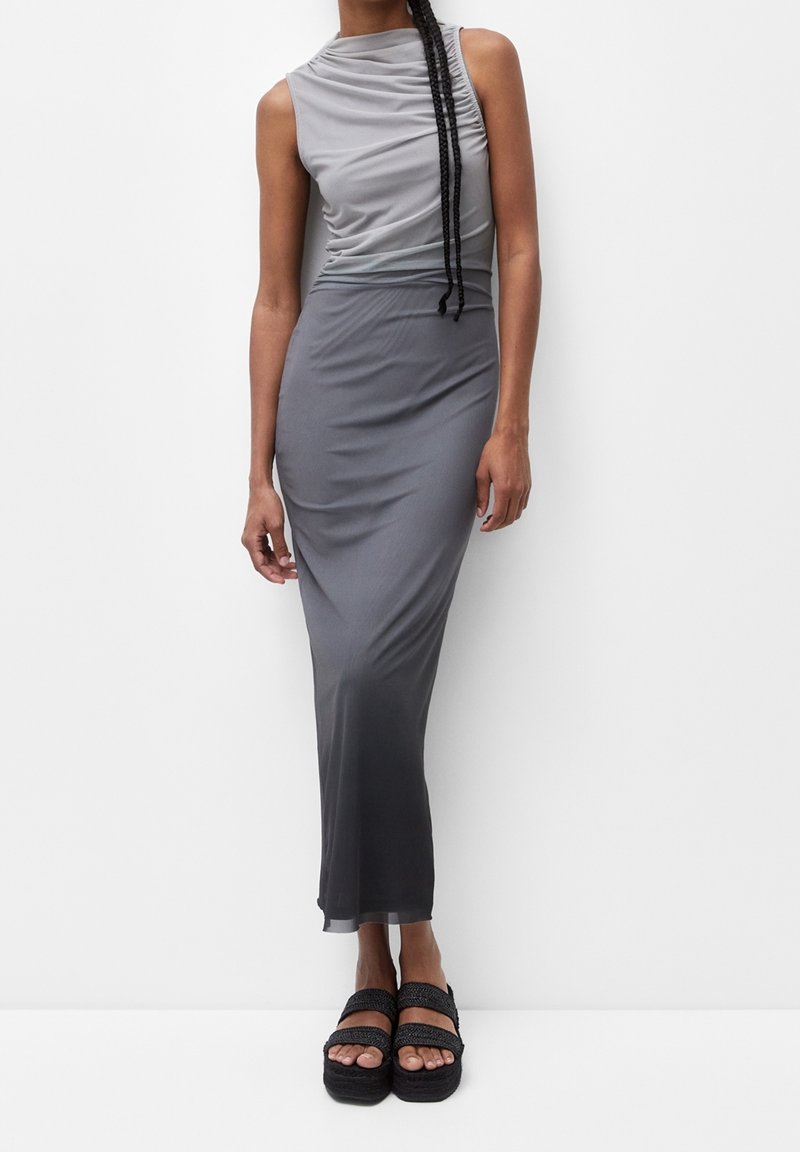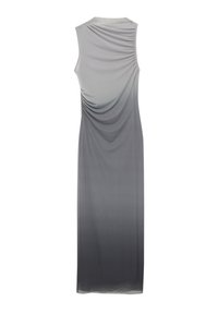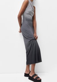 Robe sans manches gris avec une texture froncée au niveau du corsage, ajustée, et une jupe longue. Portée avec des sandales à plateforme noires à lanières.
