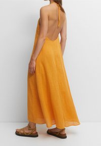 Robe maxi en tissu jaune vif avec une finition texturée, dotée d'un design à col halter. Assortie à des sandales à lanières vert olive.