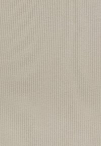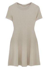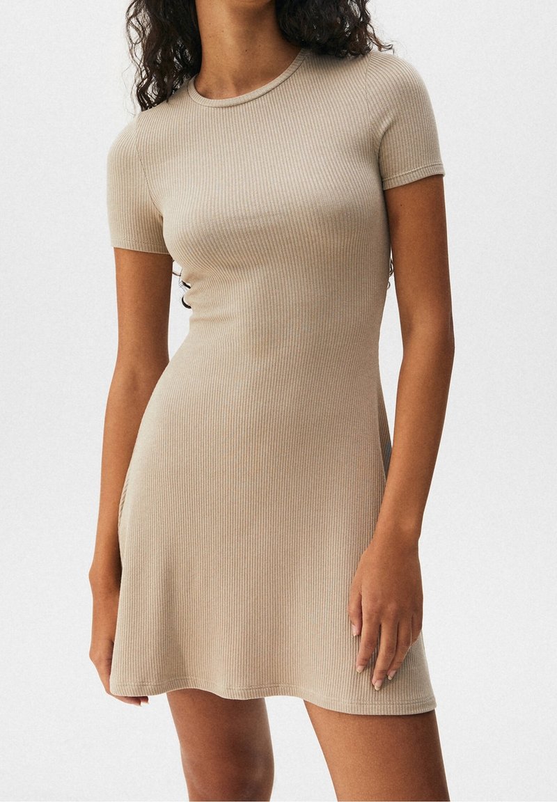 Robe côtelée beige clair avec un col rond et des manches courtes. Présente des détails sur les côtés et une silhouette ajustée qui s'évasent légèrement au niveau de l'ourlet.