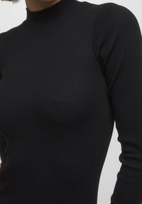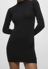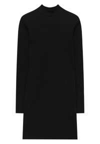 Robe noire à manches longues côtelées, col haut, coupe slim et longueur mi-cuisse. Texture lisse sans motifs ni accessoires visibles.