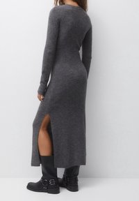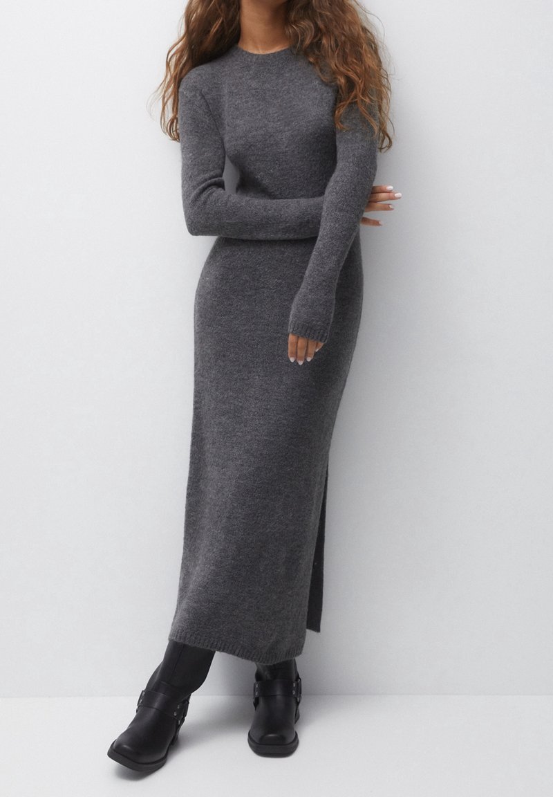 Robe maxi tricotée grise avec manches longues, coupe ajustée, fente sur le côté et poignets côtelés, associée à des bottines noires à la cheville avec un accent en boucle.