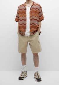 Shorts cargo beiges avec deux poches latérales, associés à une chemise tricotée à manches courtes à motifs et des baskets beiges. Chaussettes blanches unies visibles.