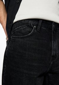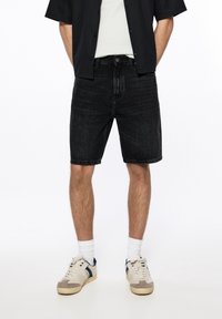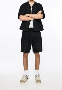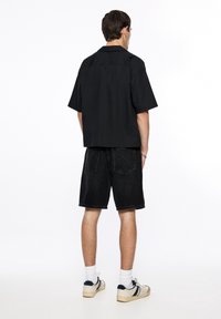 Shorts en denim noir à coupe droite, avec fermeture à bouton, passants de ceinture et ourlets cousus. À porter avec des baskets claires.