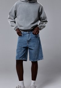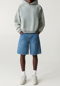 Shorts en denim bleu clair. Présentent une coupe décontractée, un style cinq poches, des passants de ceinture et un ourlet qui tombe juste au-dessus des genoux.
