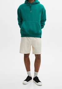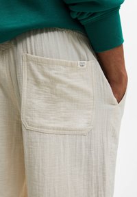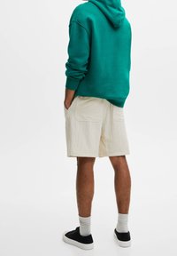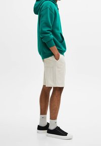 Shorts beige clair en tissu texturé, dotés d'une taille élastique et de poches latérales, associés à des baskets noires et des chaussettes de cheville grises.
