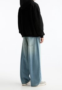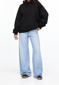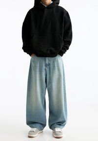 Personne portant un sweat à capuche noir avec poche frontale et un jean oversized bleu clair, debout avec les mains près des poches.