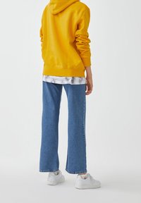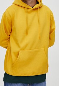 Personne portant un sweat à capuche jaune moutarde, un short en jean bleu et des baskets blanches, debout devant un fond blanc uni.