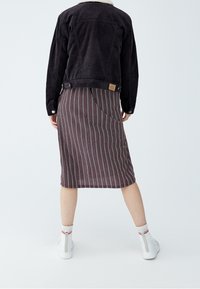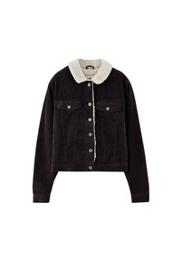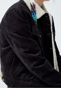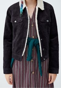 Personne portant une veste en velours côtelé marron foncé avec une doublure en polaire blanche, sur une robe boutonnée rayée nouée avec une ceinture tricotée turquoise.