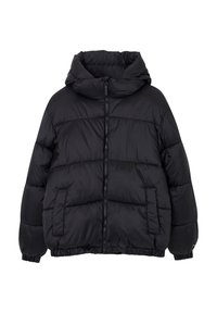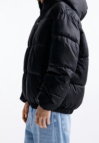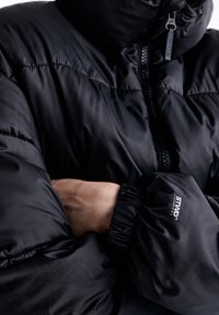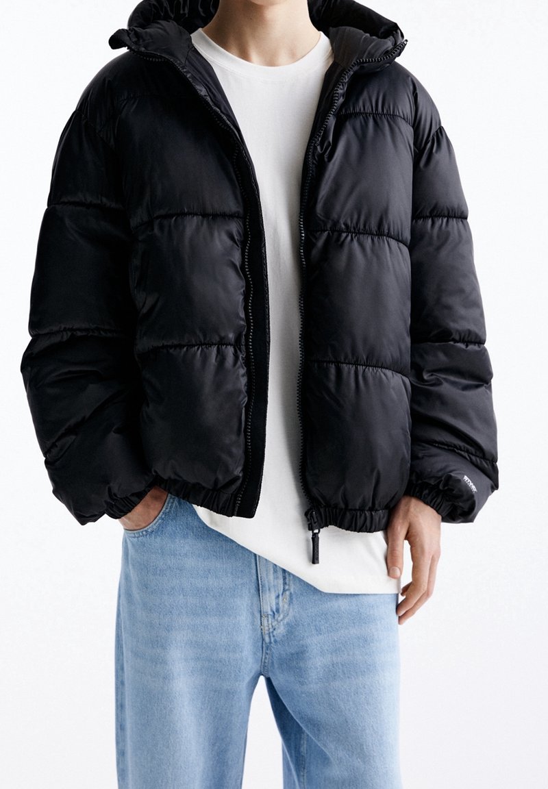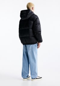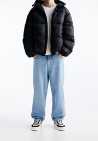 Personne portant une doudoune noire sur un t-shirt blanc et un jean bleu clair, debout avec une main dans la poche et l'autre reposant sur le côté.