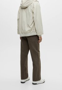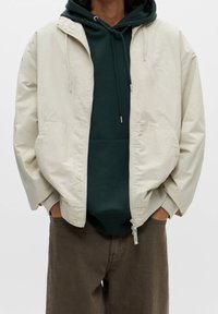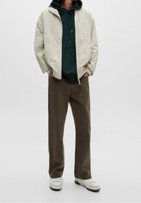 Veste zippée beige clair portée sur un sweat à capuche vert foncé, associée à un pantalon marron à coupe ample et des baskets blanches, debout devant un fond neutre.