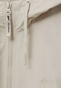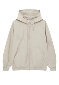 Veste zippée beige clair avec capuche, en matériau lisse. Dotée de poches latérales, de cordons de serrage réglables et de manches longues. Associée à un short sombre.