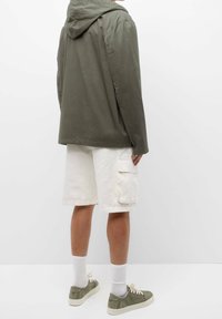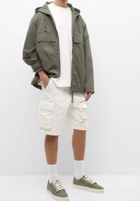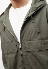 Veste à capuche vert olive avec une fermeture éclair à l'avant, deux poches poitrine et un ourlet ajustable avec cordon de serrage, portée sur un t-shirt blanc et un pantalon crème.