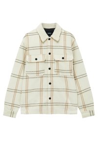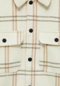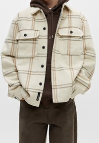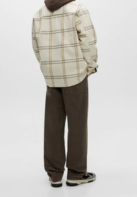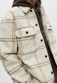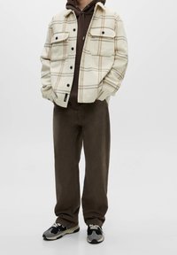 Veste à boutons à carreaux blanc cassé et beige portée sur un sweat à capuche marron, associée à un pantalon marron foncé, mains glissées dans les poches de la veste.