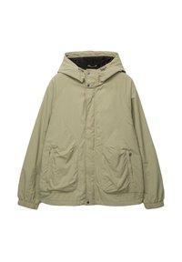Homme portant une veste à capuche vert olive clair sur un T-shirt beige avec un motif graphique et un pantalon cargo marron, les mains dans les poches, sur un fond uni.