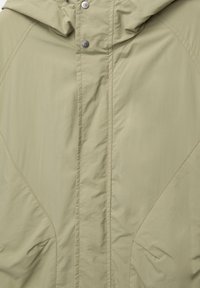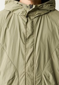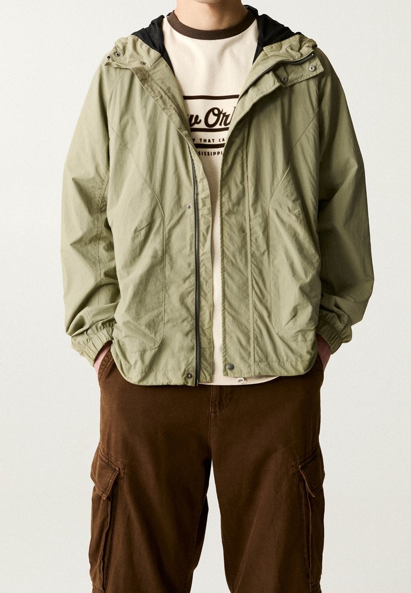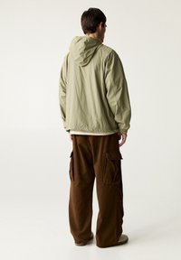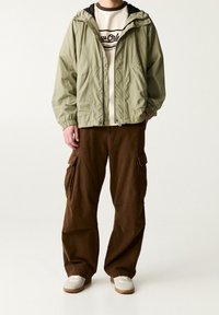 Homme portant une veste à capuche vert olive clair sur un t-shirt beige avec motif et un pantalon cargo marron, les mains dans les poches.