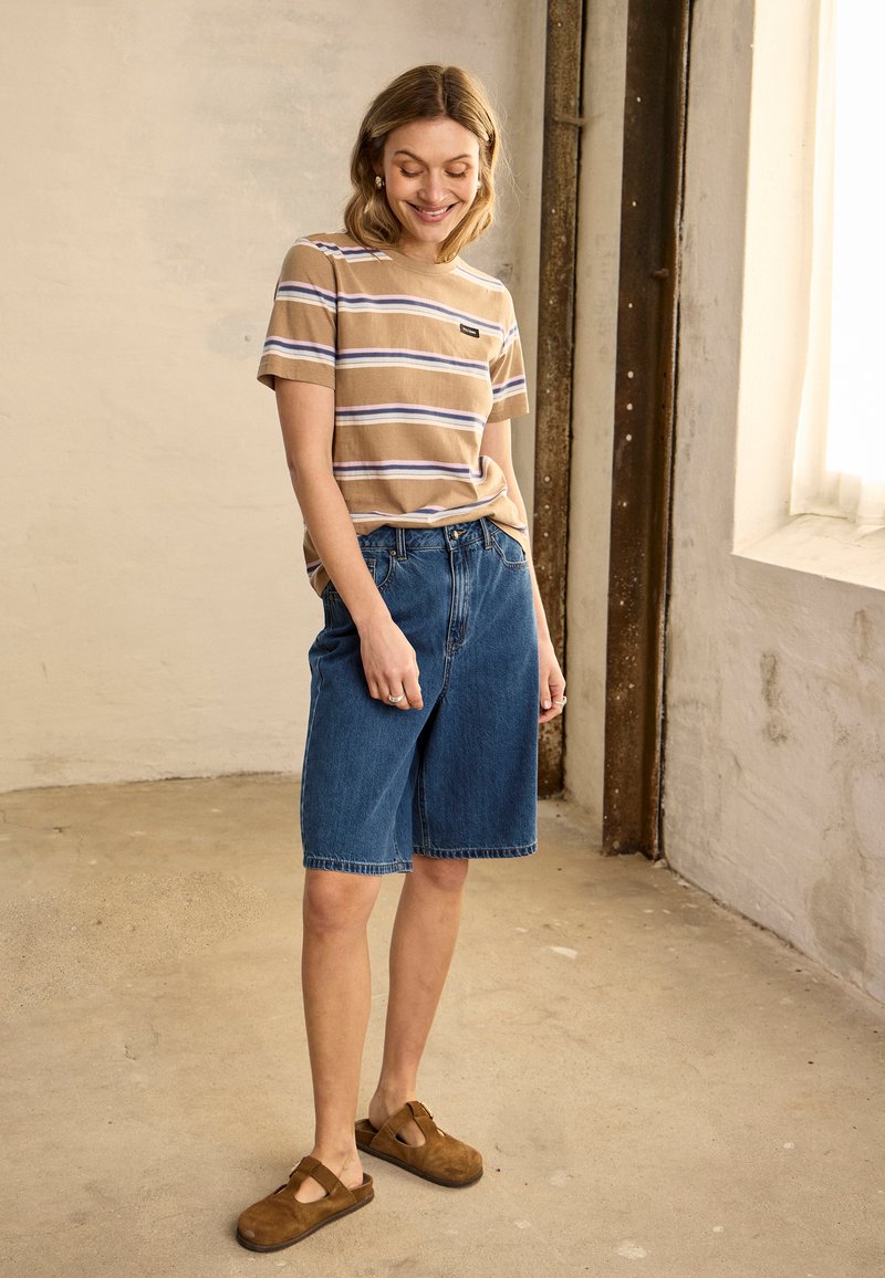 Femme debout à l'intérieur portant un t-shirt beige à rayures, un short en denim bleu arrivant aux genoux, et des chaussures marron sans lacets, souriante et regardant vers le bas.