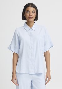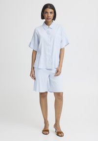 Femme aux cheveux courts et foncés portant une chemise à manches courtes bleu clair boutonnée et un pantalon bleu clair assorti, sur un fond uni.