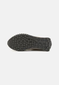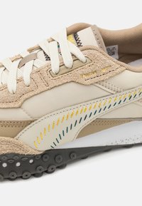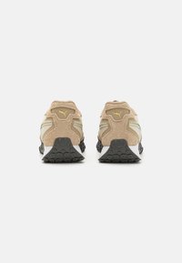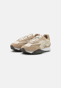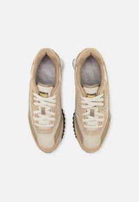 Baskets beige et marron clair avec des accents en daim texturé, des détails cousus, une semelle intermédiaire blanche avec des taches noires et une semelle extérieure noire à crampons.