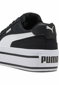 Baskets Puma noir et blanc avec une semelle plateforme blanche épaisse et une bande noire, lacets à l'avant et logo Puma blanc sur le côté.