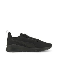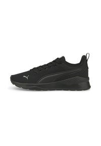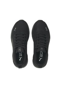 Baskets de sport noires avec une partie supérieure en mesh, design lacé, branding discret, semelle intermédiaire texturée et semelle extérieure en caoutchouc robuste pour une meilleure adhérence.