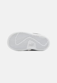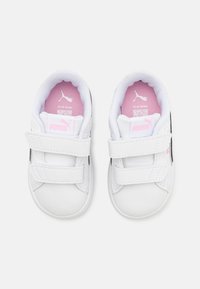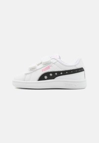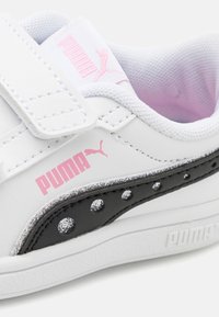 Baskets blanches avec des bandes Velcro, accents noirs, détails en paillettes et logo rose. Présentent une finition en cuir lisse et une semelle en caoutchouc.