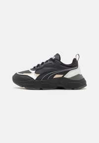 Baskets de sport noires, blanches et beige avec une semelle épaisse, un avant à lacets, une languette de marque et une poignée au niveau du talon, présentées en profil latéral.
