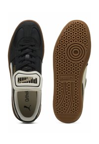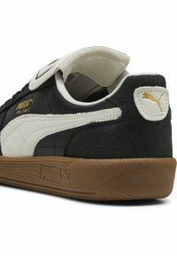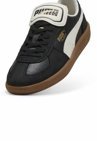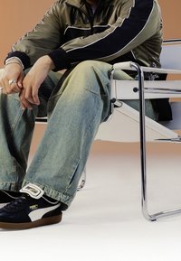 Coupe-vent noir et olive avec des bandes blanches, jean en denim bleu, et baskets Puma noires avec des accents blancs, assis sur une chaise chromée.