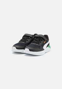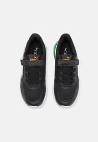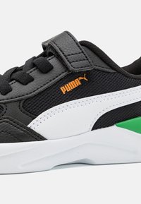 Baskets Puma en noir et blanc avec détail vert au talon, logo orange, dessus en mesh et cuir, bride à scratch, et semelle en caoutchouc blanche, vue de côté.