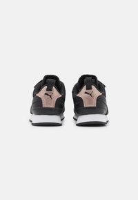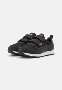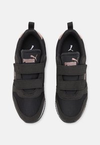 Chaussures de sport noires avec dessus en daim et mesh, dotées de deux bandes Velcro, d'une semelle en caoutchouc texturée et d'un accent métallique sur le talon.
