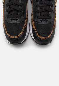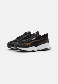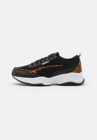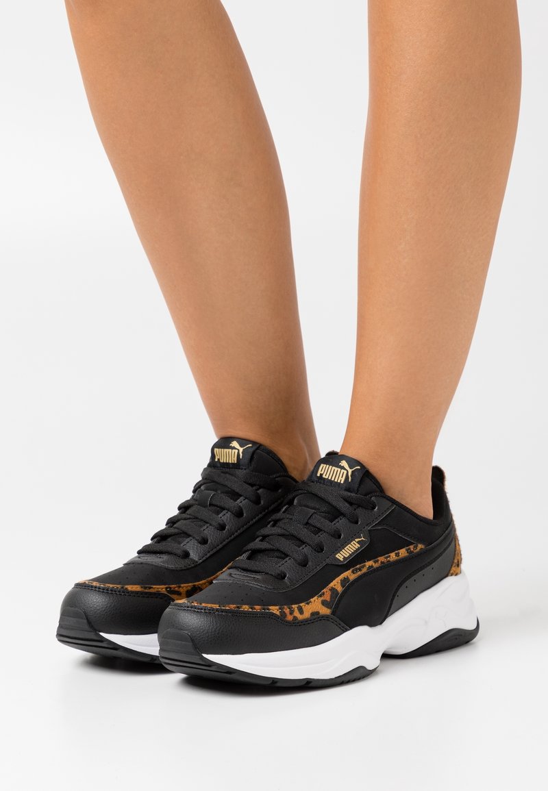 Baskets noires avec accents imprimé léopard, cuir texturé, semelle intermédiaire blanche et lacets noirs. Logo Puma sur la languette et le côté.