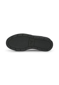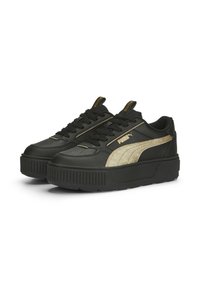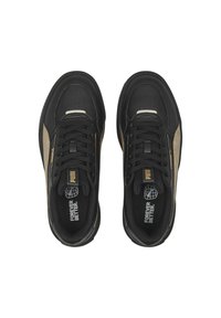 Baskets noires avec une semelle épaisse noire, ornées d'une bande en daim beige et d'accents dorés. Design à lacets, matériau texturé et forme arrondie.