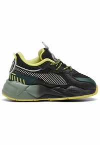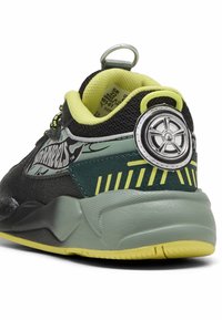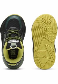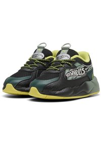 Basket enfant noir et vert avec semelle jaune, lacets à motifs et logo "Hot Wheels" sur le côté.
