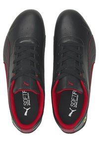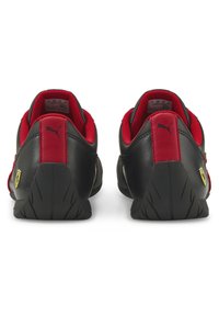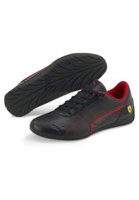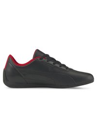 Baskets Puma basses noires avec accents rouges, lacets noirs et logo Ferrari au talon, vues de profil sur fond blanc.