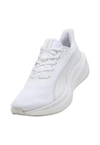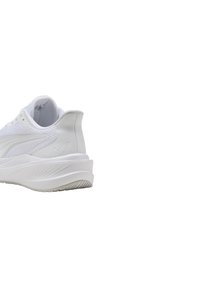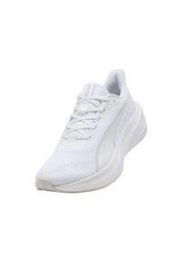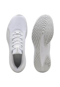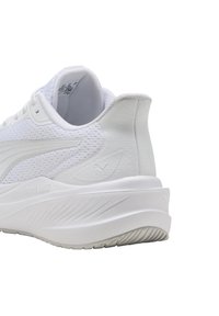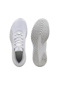Baskets blanches de sport avec dessus en maille, semelle rembourrée et logo Puma sur le côté et la semelle intermédiaire, vues de profil droit.