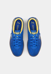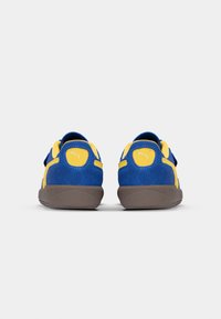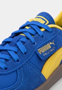 Baskets bleues et jaunes en suède et textile, avec une coupe basse, un laçage, une semelle extérieure en caoutchouc et un logo en relief.