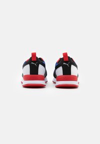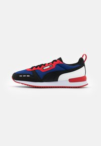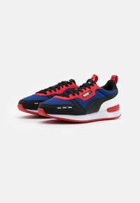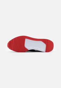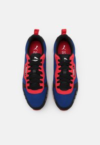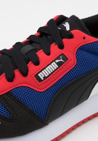 Baskets athlétiques noires, bleues et rouges avec une tige en mesh, un col rembourré et une semelle intermédiaire blanche avec des accents rouges. Lacets et logo sur le côté.
