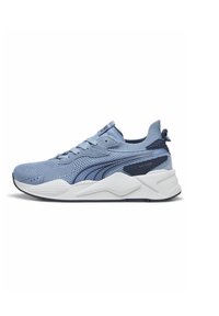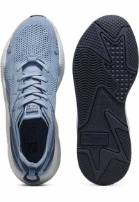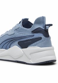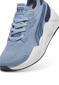 Baskets de sport tricotées bleu clair avec des accents bleu foncé, semelle épaisse blanche et languette de traction au talon, vues de profil.