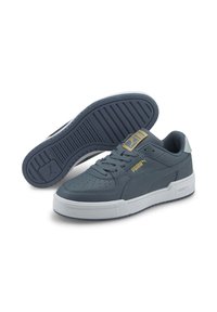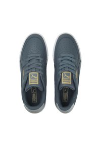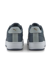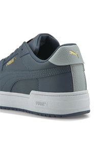 Baskets en cuir gris foncé avec une semelle blanche, dotées d'un orteil perforé, d'accents de logo doré et d'un contrefort de talon gris.