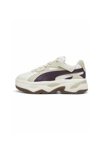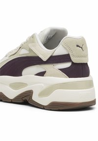Baskets blanches Puma avec des rayures violettes portées avec des chaussettes gris clair et un pantalon large à côtes de couleur violet foncé sur un fond gris clair.