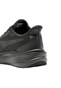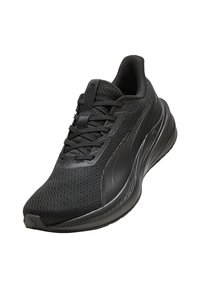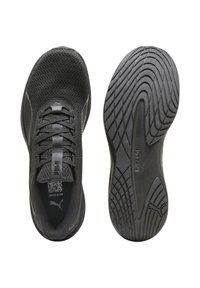 Baskets de sport noires avec dessus en mesh, design à lacets, et semelle épaisse coussinée marquée "PUMALITE", vues de profil.