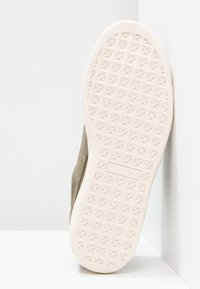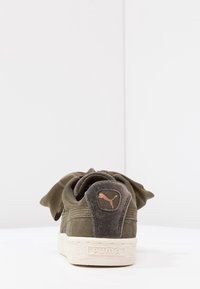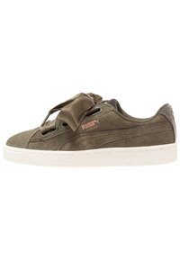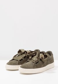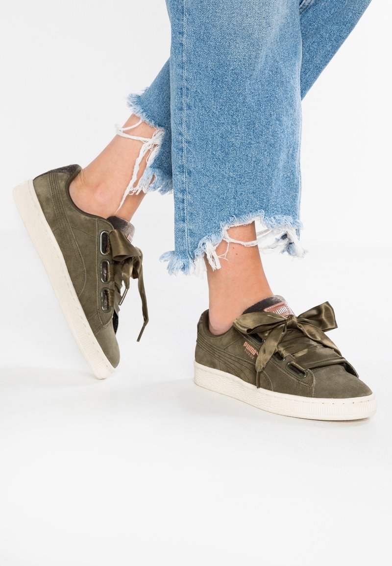 Personne portant des baskets Puma en daim vert olive avec de larges lacets en satin et un jean bleu clair à ourlet effiloché sur fond blanc.