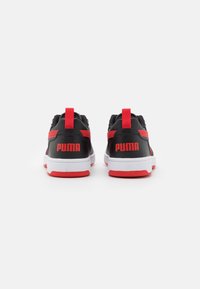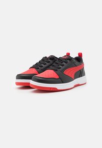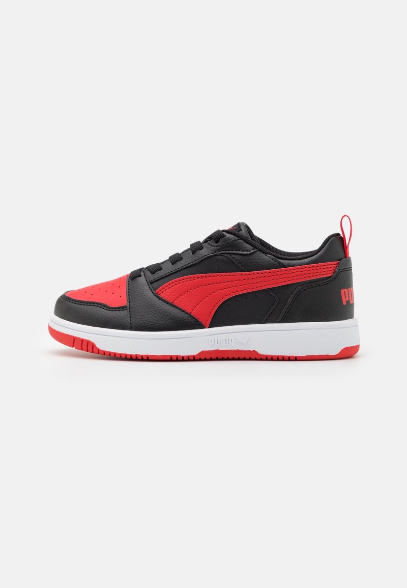 Baskets noires et rouges à tige basse avec semelle blanche, présentant une bande et un logo Puma rouges sur le talon et la semelle, vues depuis le côté gauche.