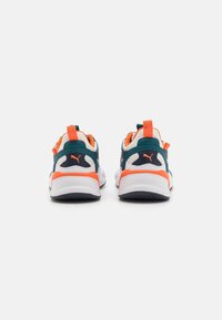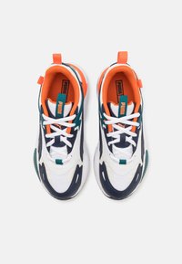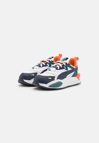 Baskets avec un upper en maille blanche, accents navy, détail de talon vert, languette orange et semelle texturée contrastante. Lacets flexibles inclus.