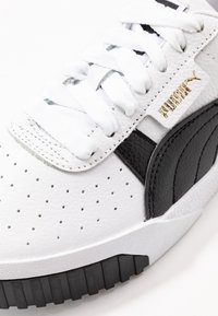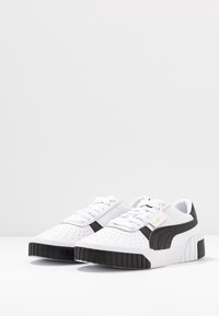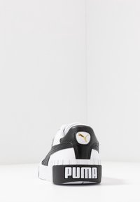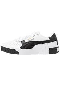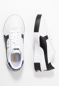 Baskets blanches avec accents noirs, cuir lisse et caoutchouc texturé, présentant des perforations, un design à lacets et une semelle blanche épaisse.